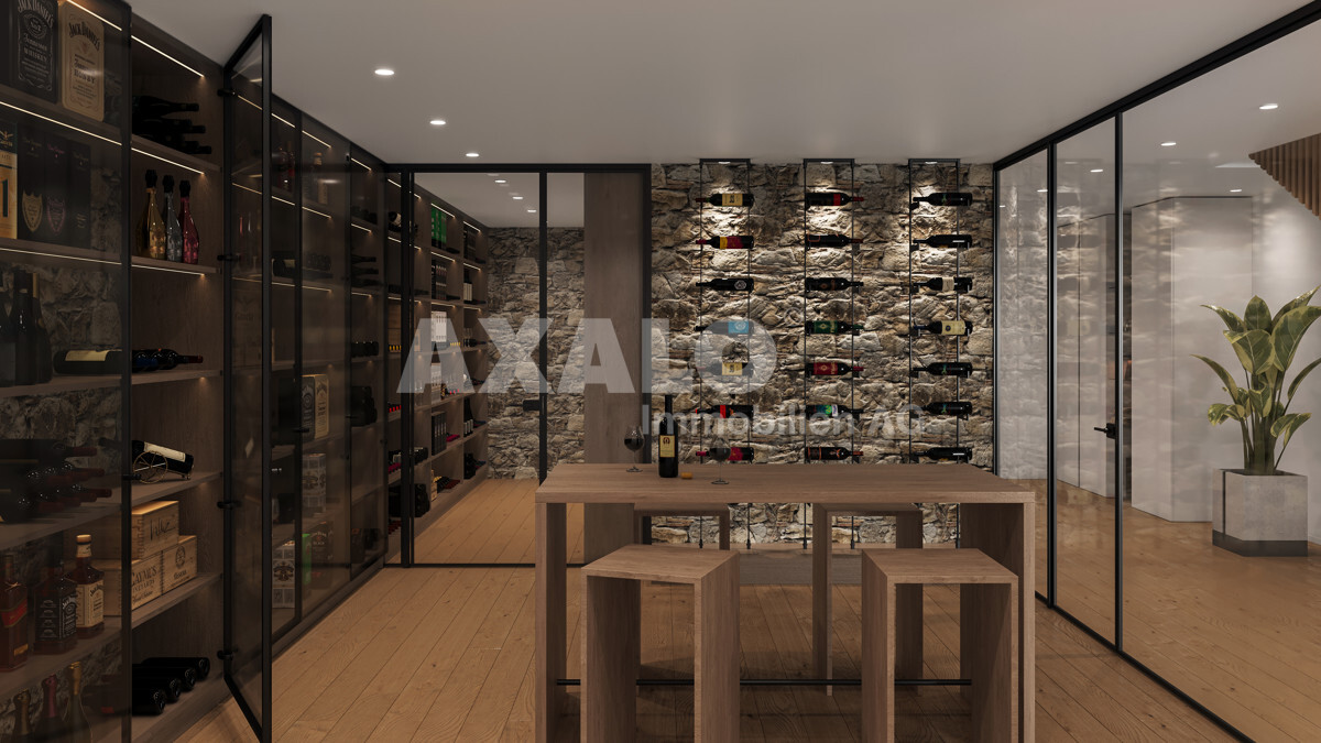 Im Untergeschoss sind ein grosszügiger Fitness- und Spa-Bereich geplant, ein weitläufiger Weinkeller, ein separates WC sowie weitere praktische Neben- und Technikräume. Die grosse Garage bietet Platz für bis zu vier Fahrzeuge.