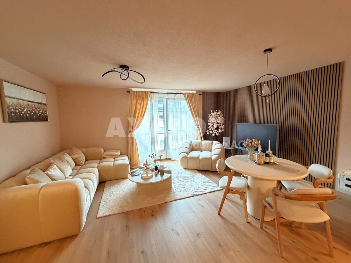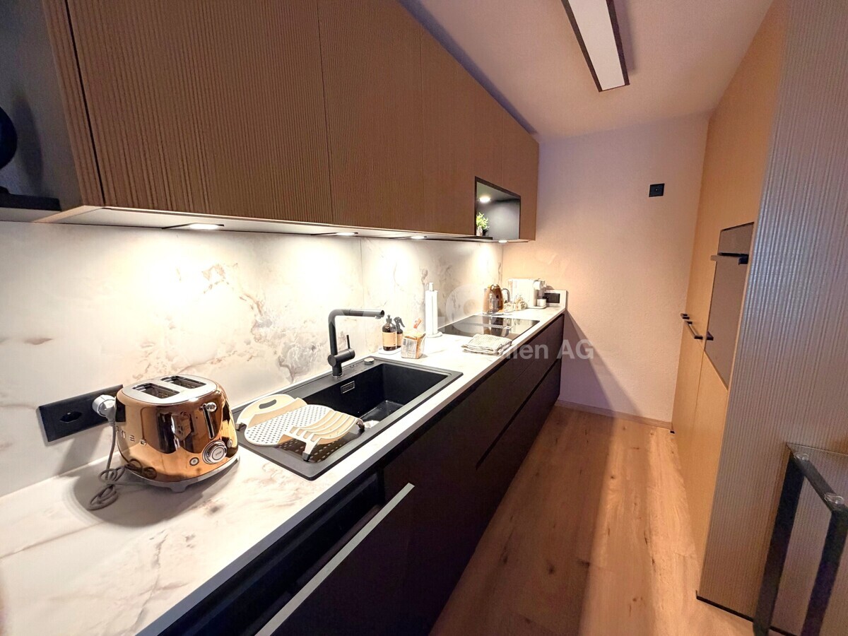 Im Mittelpunkt steht der offene Wohn- und Essbereich mit integrierter Küche. Hier fliessen Kochen, Essen und Wohnen harmonisch ineinander. Die massgefertigte Küche ist mit hochwertigen Materialien, viel Stauraum und modernen Geräten ausgestattet und eignet sich ideal für alle, die Funktionalität und Design schätzen. Der Wohnbereich wirkt dank der grosszügigen Fensterfronten hell und einladend und bietet eine angenehme Atmosphäre für gemütliche Abende oder den Empfang von Gästen.